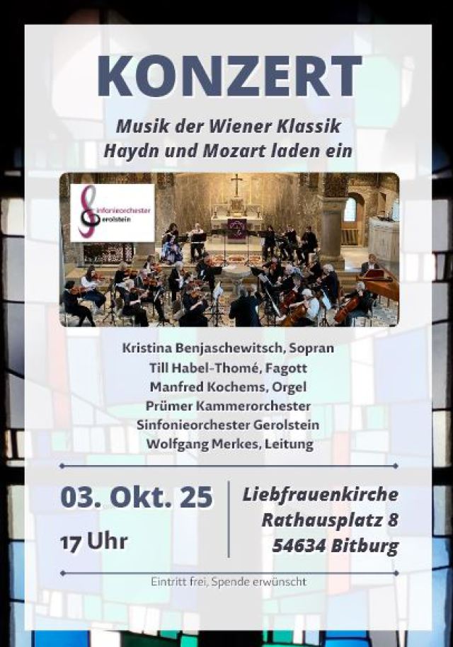 Mitwirkende waren der Bläserkreis St. Anna Gerolstein, das Kammerorchester Prüm, das Sinfonieorchester Gerolstein sowie die Solisten Kristina Benjaschewitsch (Violine) und Till Habel-Thomé (Fagott).
